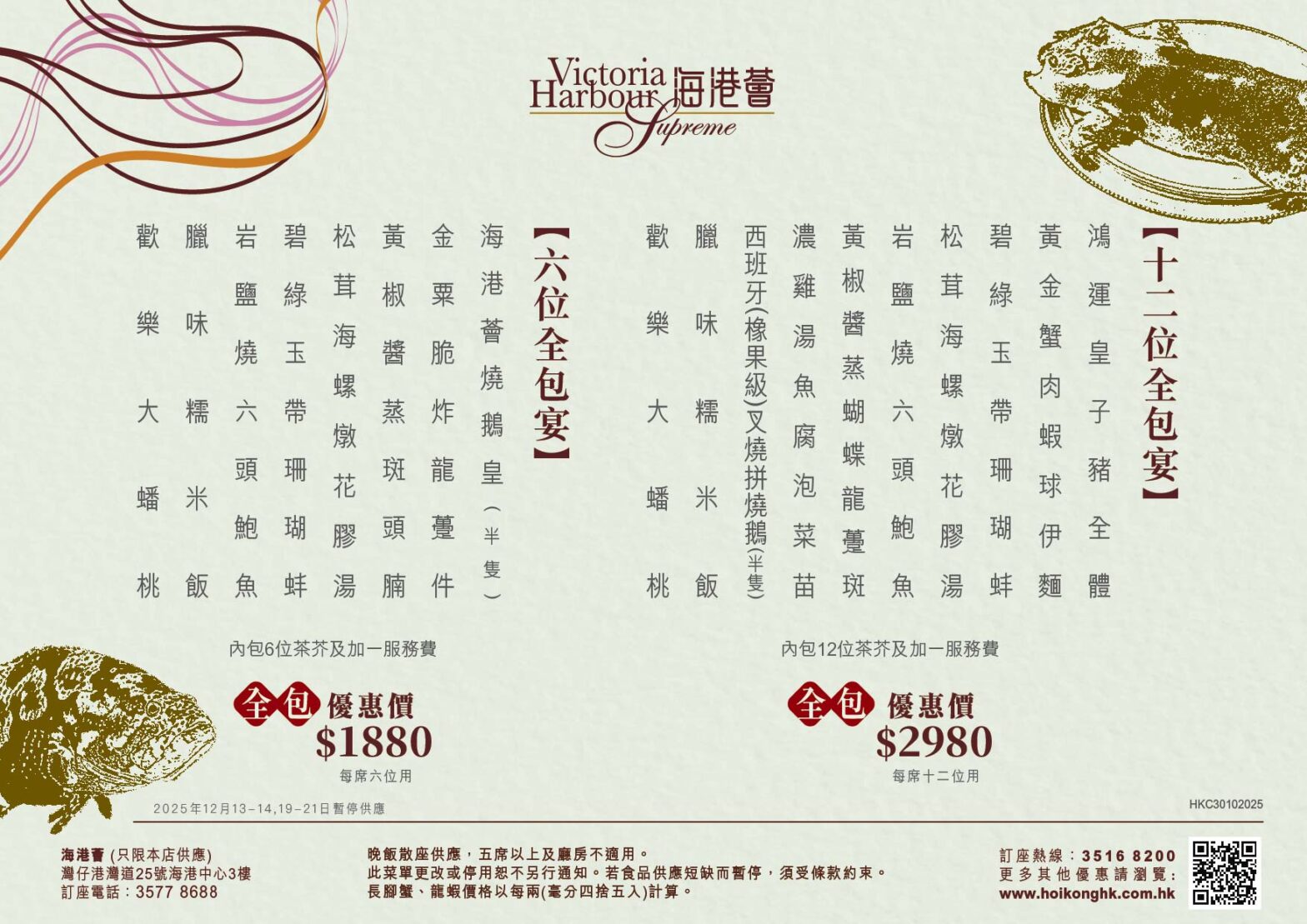 六位/十二位全包宴(灣仔店)2025年11月6日起供應 12月13-14,19-21日暫停供應 晚飯散座供應 海港薈-灣仔店香港灣仔港灣道25號海港中心地下G3號舖及3樓 (鄰近會展中心、 灣仔港鐵站 A5出囗行人天橋穿過入境事務大樓 或 會展站A出口)