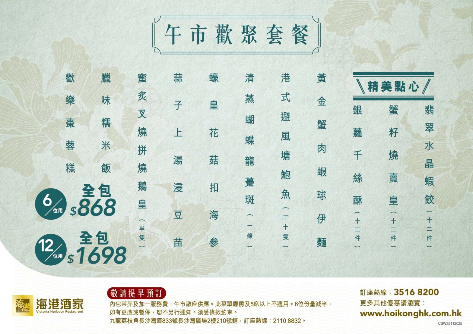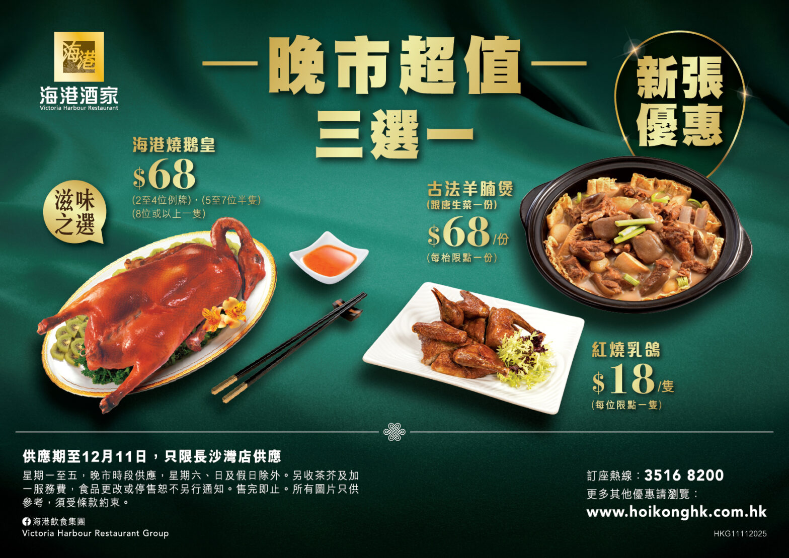 海港酒家-長沙灣店營業時間:08:00 - 23:00訂座熱線:2110 8832地址:九龍荔枝角長沙灣道833號長沙灣廣場2樓210號舖菜單午市歡聚套餐(海港長沙灣店供應)2025年11月29日起午市散座供應人數: 6人或12人晚市超值三選一(海港長沙灣店供應)2025年12月1日起,周一至周五晚市供應人數: 人秋之蟹逅 時令大閘蟹人數: 人古法羊腩煲堂食另收茶芥及加一服務費。人數: 人秋冬時令午市精選(海港始創、維景、上環店不適用)星期一至五,午市時段供應人數: 人紅燒乳鴿(上環、維景、始創、馬中店不適用)星期一至五,午市時段供應 人數: 人金秋大閘蟹宴(海港上環店及海港薈尖沙咀、灣仔、利舞臺店不適用)2025年10月22日起供應人數: 6人或12人長腳蟹乳豬宴&龍蝦乳豬宴(海港薈灣仔店、尖沙咀店、利舞臺店不適用)2025年12月12-14及19-21日暫停供應人數: 12人超值全包宴(海港上環店及海港薈不適用)2025年12月12-14及19-21日暫停供應人數: 6人或12人