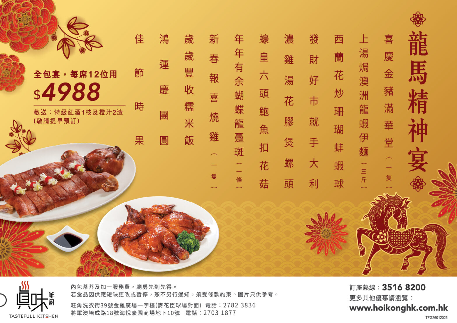 真味鮮廚-坑口店營業時間:07:00 - 00:00訂座熱線:2703 1877地址:新界西貢將軍澳培成路18號海悅豪園地下10號舖 菜單歡樂賀壽彌月百日宴(真味鮮廚)人數: 12人新春鮑魚花膠尚品鍋人數: 6人或12人如意龍蝦鮑魚宴&發財好市宴&吉慶有餘龍蝦宴(海港上環店不適用)供應期由2026年2月3日至3月1日止人數: 8人或12人慶新春午市超值宴供應期由2026年2月3日至3月1日止人數: 6人或12人龍馬精神宴供應期由2026年2月3日至3月1日止人數: 12人超值全包宴(海港上環店及海港薈不適用)人數: 6人或12人長腳蟹乳豬宴&龍蝦乳豬宴(海港薈尖沙咀店、灣仔店、利舞臺店不適用)人數: 12人