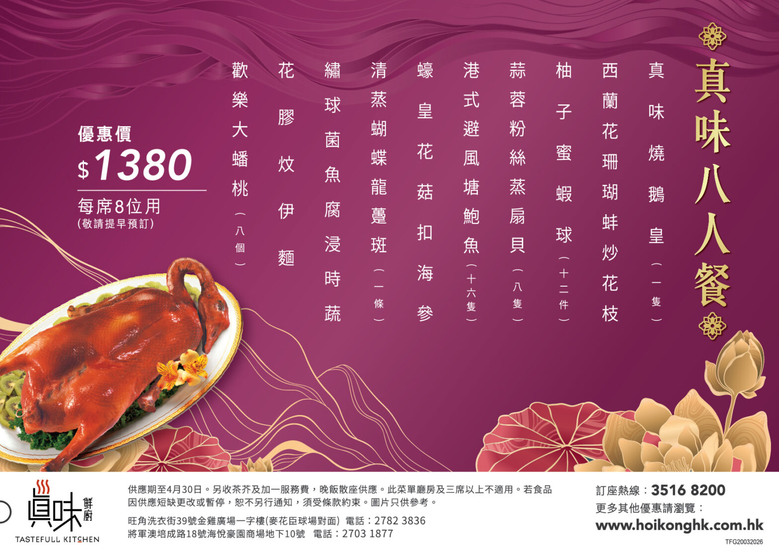 真味鮮廚-金雞店營業時間:08:00 - 00:00訂座熱線:2782 3836地址:九龍旺角洗衣街39號金雞廣場1字樓 菜單歡樂賀壽彌月百日宴(真味鮮廚)人數: 12人超值全包宴(海港上環店及海港薈不適用)2026年4月13日起供應人數: 6人或12人長腳蟹乳豬宴&龍蝦乳豬宴(海港薈尖沙咀店、灣仔店、利舞臺店不適用)人數: 12人時令午市精選星期一至五,午市時段供應人數: 人晚市優惠孖寶晚市5:30後供應人數: 人真味八人餐(真味鮮廚)人數: 8人