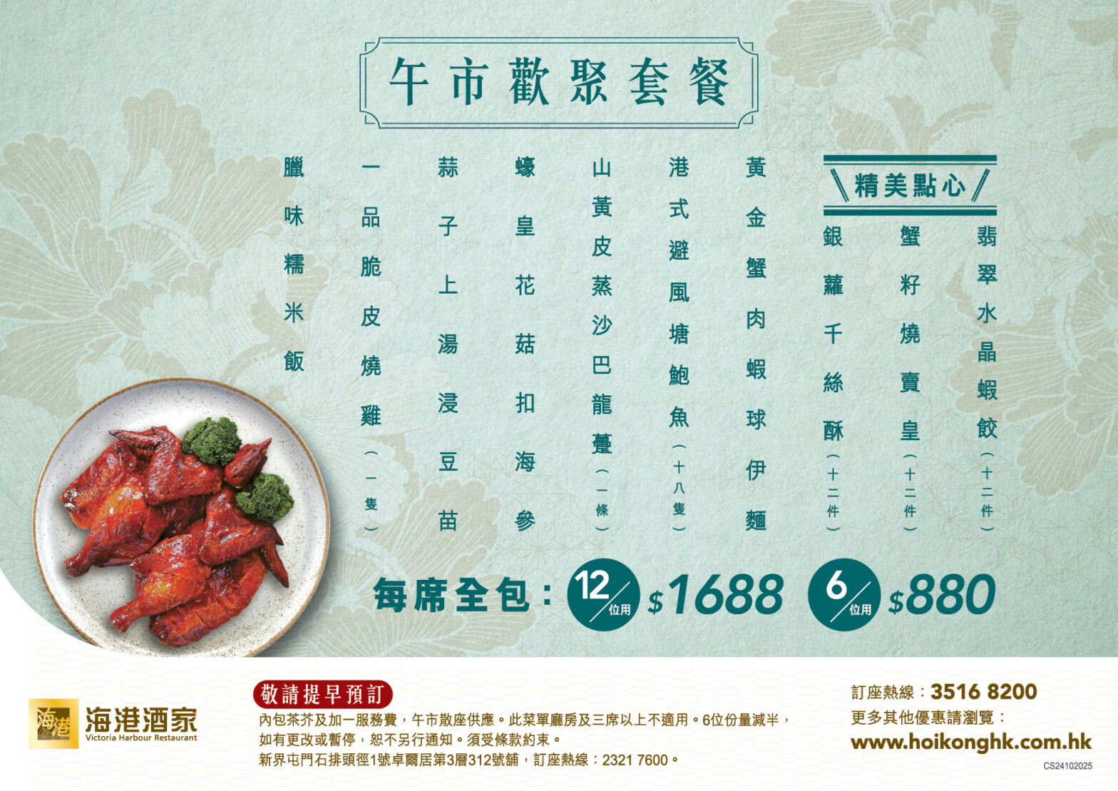 海港酒家-屯門卓爾店營業時間:07:00 - 23:00訂座熱線:2321 7600地址:新界屯門石排頭徑1號卓爾廣場第3層312號舖 菜單午市孖寶(海港始創、維景、上環店不適用)上午十一時至下午三時半供應人數: 人超值全包宴(海港上環店及海港薈不適用)人數: 6人或12人長腳蟹乳豬宴&龍蝦乳豬宴(海港薈灣仔店、尖沙咀店、利舞臺店不適用)人數: 12人堂剪紅燒乳鴿(上環、維景、始創、馬中店不適用)星期一至五,上午十一時至下午三時供應 人數: 人午市歡聚套餐(限卓爾居店供應)人數: 6人或12人歡樂賀壽彌月百日宴(上環店不適用)海港酒家上環店不適用人數: 12人豪華賀壽彌月百日宴(上環店不適用)人數: 12人歡樂八人全包宴2025年12月13-14日、19-21日暫停供應人數: 8人古法羊腩煲堂食另收茶芥及加一服務費。人數: 人晚市優惠孖寶晚飯時段供應。菜單停售或變更恕不另行通知。人數: 人秋之蟹逅 時令大閘蟹人數: 人金秋大閘蟹宴(海港上環店及海港薈尖沙咀、灣仔、利舞臺店不適用)2025年10月22日起供應人數: 6人或12人