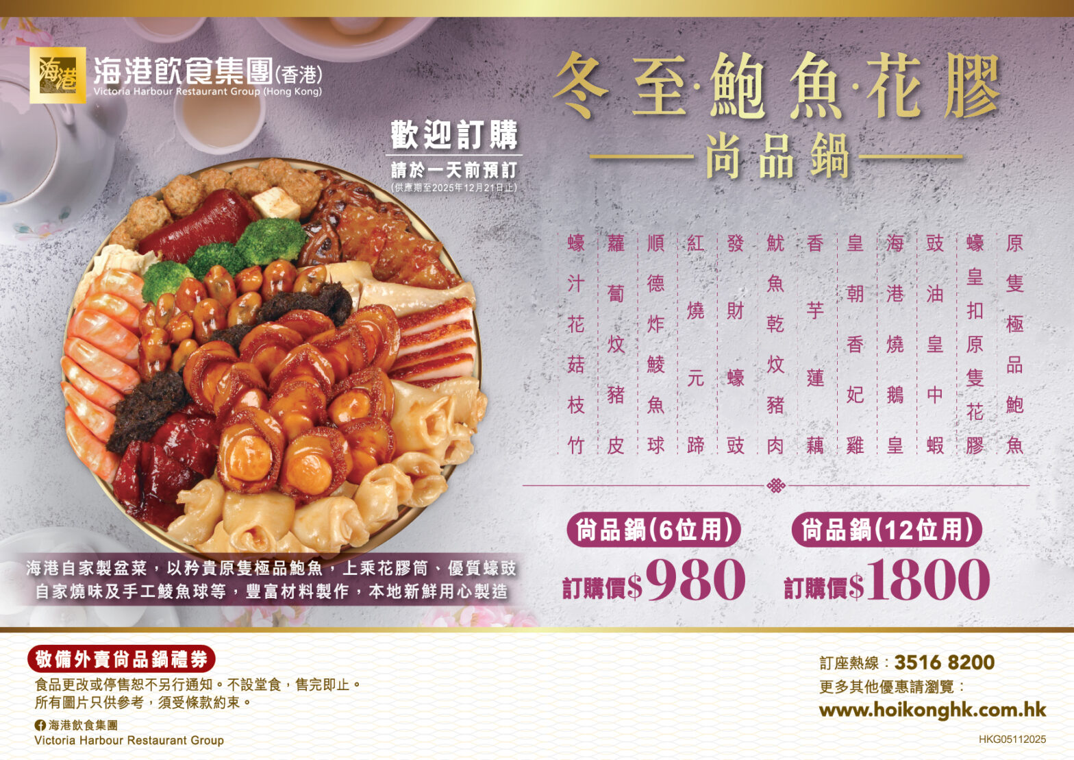 海港酒家-旺角始創店營業時間:07:30 - 23:00訂座熱線:2369 6380地址:九龍旺角彌敦道750號始創中心4樓401號舖 菜單長腳蟹乳豬宴&龍蝦乳豬宴(海港薈灣仔店、尖沙咀店、利舞臺店不適用)2025年12月12-14及19-21日暫停供應人數: 12人超值全包宴(海港上環店及海港薈不適用)2025年12月12-14及19-21日暫停供應人數: 6人或12人歡樂賀壽彌月百日宴(上環店不適用)2025年11月28日起供應人數: 12人豪華賀壽彌月百日宴(上環店不適用)2025年11月28日起供應人數: 12人南非吉品鮑魚龍蝦宴(限海港維景、始創供應)2025年7月3日起供應人數: 12人古法羊腩煲堂食另收茶芥及加一服務費。人數: 人秋之蟹逅 時令大閘蟹人數: 人金秋大閘蟹宴(海港上環店及海港薈尖沙咀、灣仔、利舞臺店不適用)2025年10月22日起供應人數: 6人或12人冬至鮑魚花膠尚品鍋人數: 6人或12人