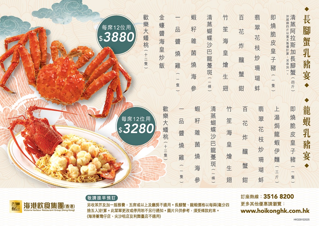 海港酒家-上環店營業時間:08:00 - 23:00訂座熱線:3643 0228地址:香港上環安泰街7號康威花園地下 菜單長腳蟹乳豬宴&龍蝦乳豬宴(海港薈灣仔店、尖沙咀店、利舞臺店不適用)人數: 12人饗宴(上環店)人數: 12人商務午市優惠套餐(海港酒家上環店供應)人數: 6人或12人樂融融歡聚宴(海港酒家上環店供應)人數: 12人南非吉品鮑魚龍蝦宴(限海港維景、始創、上環店供應)2025年7月3日起供應人數: 12人古法羊腩煲堂食另收茶芥及加一服務費。人數: 12人