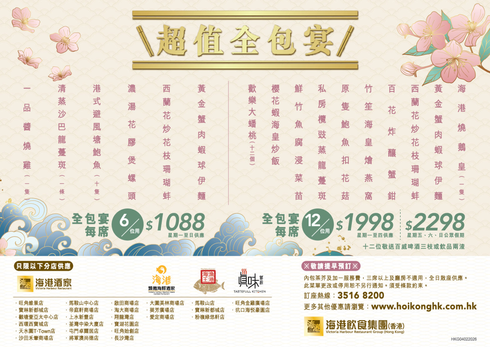 海港燒鵝海鮮酒家-屯門愛定店營業時間:07:00 - 23:00訂座熱線:2117 8980地址:新界屯門友愛邨友愛路愛定商場(H.A.N.D.S)S區第三層S-321號鋪菜單歡樂賀壽彌月百日宴(上環店不適用)2025年11月28日起供應人數: 12人豪華賀壽彌月百日宴(上環店不適用)2025年11月28日起供應人數: 12人新春鮑魚花膠尚品鍋人數: 6人或12人如意龍蝦鮑魚宴&發財好市宴&吉慶有餘龍蝦宴(海港上環店不適用)供應期由2026年2月3日至3月1日止人數: 8人或12人富貴吉祥宴&年年豐盛宴&發財好市宴(海港上環店不適用)供應期由2026年2月3日至3月1日止人數: 12人慶新春午市超值宴供應期由2026年2月3日至3月1日止人數: 6人或12人新春南非吉品鮑魚龍蝦宴(海港薈利舞臺店不適用)供應期由2026年2月1日至3月1日止人數: 12人超值全包宴(海港上環店及海港薈不適用)人數: 6人或12人長腳蟹乳豬宴&龍蝦乳豬宴(海港薈尖沙咀店、灣仔店、利舞臺店不適用)人數: 12人