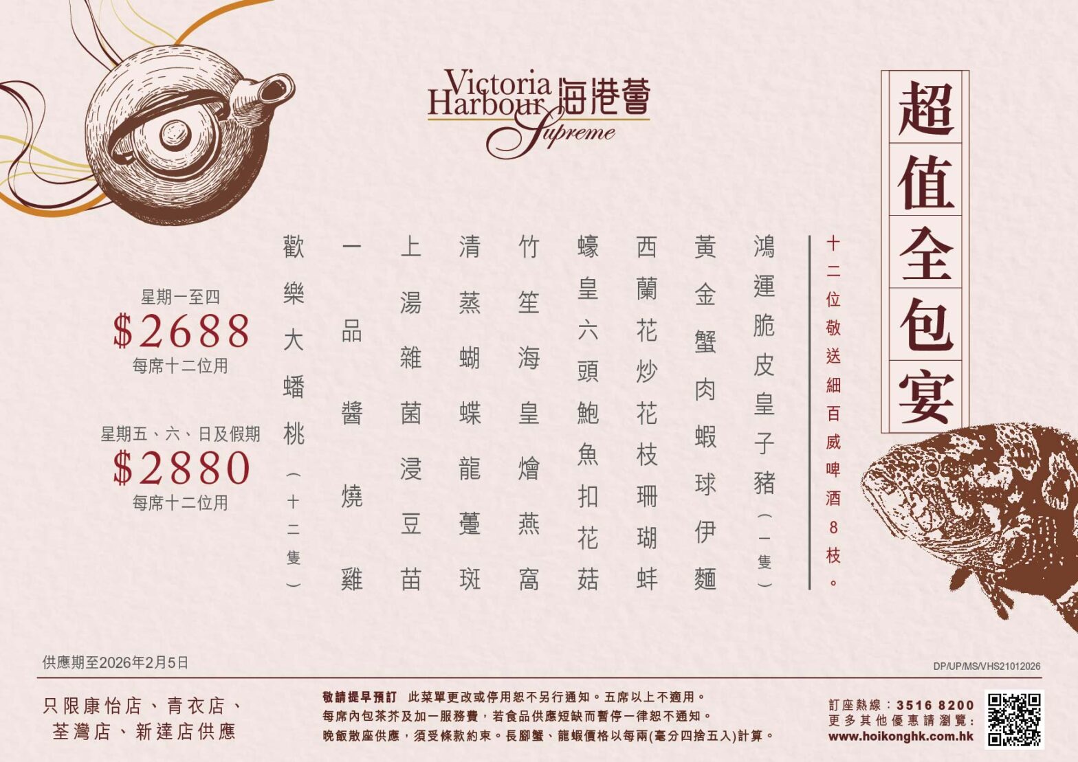 海港薈-愉景新城店營業時間:08:00 - 23:00 訂座熱線:2116 3277地址:新界荃灣青山公路荃灣段398號愉景新城購物商場3樓3005號舖(港鐵荃灣站A3出口)菜單長腳蟹乳豬宴&龍蝦乳豬宴(海港薈灣仔店、尖沙咀店、利舞臺店不適用)人數: 12人夏日廳房專享12人全包宴(海港薈愉景店供應)人數: 12人賀壽百日宴(海港薈愉景店供應)人數: 12人古法羊腩煲 (海港薈)堂食另收茶芥及加一服務費。人數: 人超值全包宴(海港薈康怡、青衣、愉景、新達店供應)2026年1月24日起供應人數: 12人超值午市全包宴(限愉景新城店供應)午市散座供應人數: 6人或12人新春南非吉品鮑魚龍蝦宴(海港薈利舞臺店不適用)供應期由2026年2月1日至3月1日止人數: 12人年年有餘宴&鮑魚魚翅宴&喜慶龍蝦宴(海港薈利舞臺店不適用)供應期由2026年2月3日至3月1日止人數: 8人或12人年年豐盛宴&富貴龍蝦宴&招財進寶宴(海港薈利舞臺店不適用)供應期由2026年2月3日至3月1日止人數: 12人慶新春午市超值宴(海港薈利舞臺店不適用)供應期由2026年2月3日至3月1日止人數: 6人或12人