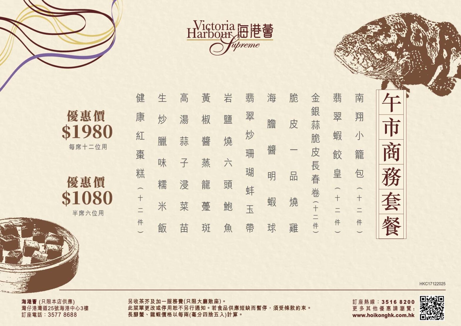 海港薈-灣仔店營業時間:10:00-15:00 / 17:30-23:00訂座熱線:3577 8688地址:香港灣仔港灣道25號海港中心地下G3號舖及3樓 (鄰近會展中心、 灣仔港鐵站 A5出囗行人天橋穿過入境事務大樓 或 會展站A出口) 菜單午市商務套餐(灣仔店)人數: 6人或12人六位/十二位全包宴(灣仔店)12月13-14,19-21日暫停供應 晚飯散座供應人數: 6人/12人澳洲龍蝦鮑魚宴(灣仔店)人數: 12人私房盛宴(灣仔店)人數: 12人長腳蟹豪情全包宴(灣仔店)人數: 12人南非吉品鮑魚龍蝦宴(海港薈供應)人數: 12人歡聚宴(利舞臺、康怡店不適用)人數: 12人澳洲龍蝦八人餐+南非吉品鮑魚宴+長腳蟹鮑魚宴(灣仔店)人數: 8人或12人古法羊腩煲 (海港薈)堂食另收茶芥及加一服務費。人數: 人鴻運棗蓉糕&臘味蘿蔔糕&椰汁年糕供應期至2026年2月16日下午17:30止人數: 人